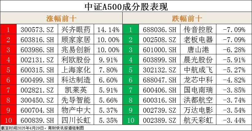 中证A500指数成分股涨幅前十、跌幅前十