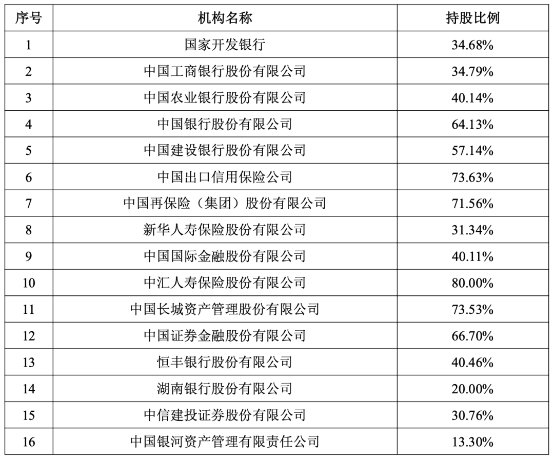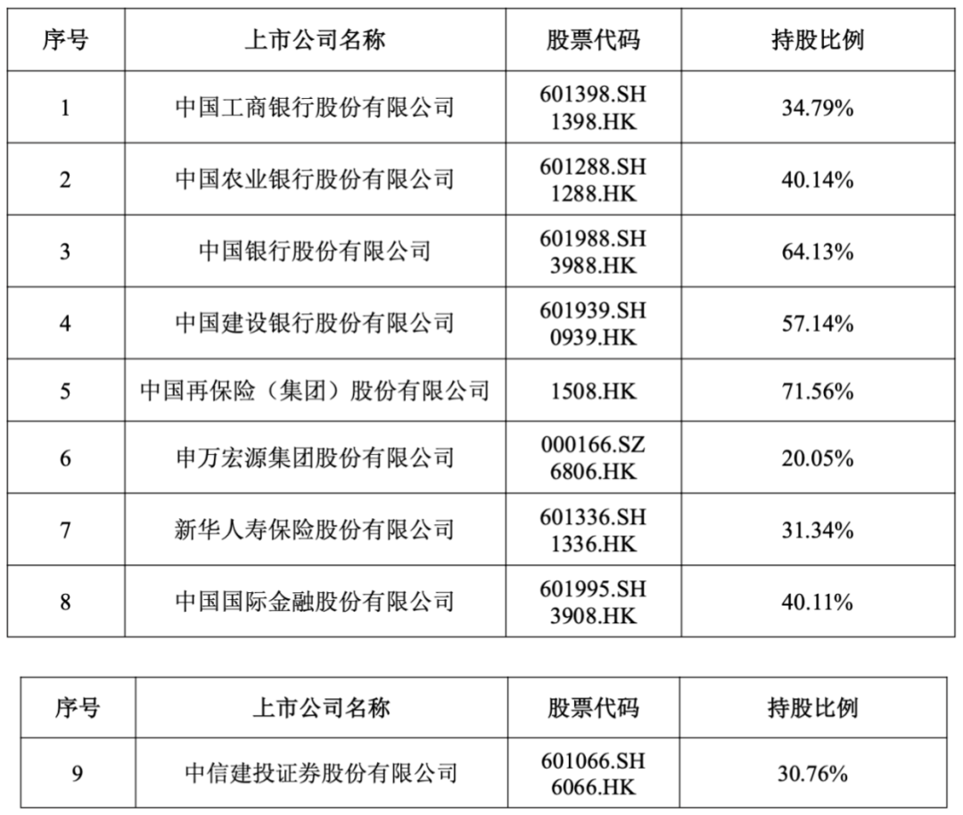 据公告披露,目前中央汇金是多家银行、券商、保险公司等金融机构的大股东、实际控制人,包括工商银行、农业银行、中国银行、建设银行、中再保险、申万宏源、新华保险、中金公司、中信建投等上市公司,还有国家开发银行、中国出口信用保险公司、中汇人寿保险、中国长城资产、中证金融公司、恒丰银行、湖南银行、中国银河资产等。