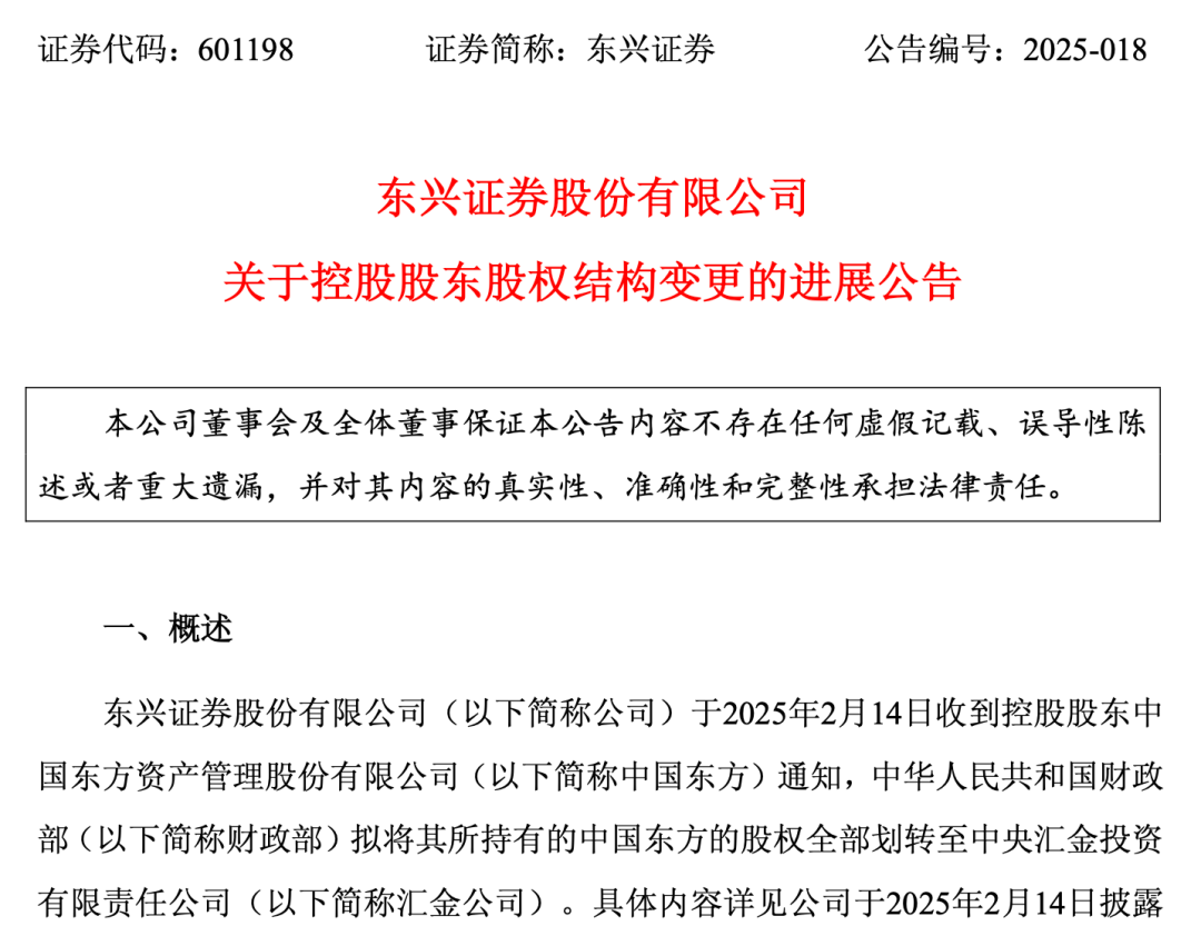 东兴证券披露的《关于控股股东股权结构变更的进展公告》显示,今年2月14日收到控股股东中国东方通知,财政部拟将其所持有的中国东方的股权全部划转至中央汇金。5月6日,中国东方收到批复,金融监管总局正式批准本次股权变更。
